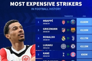 足壇歷史前鋒轉(zhuǎn)會費榜:姆巴佩1.8億歐居首,?;倏?500萬歐第5