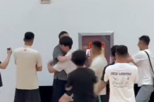 楊瀚森與青島隊(duì)工作人員握手致意,并與青島隊(duì)主帥劉維偉熱情相擁,兩人打趣交流。