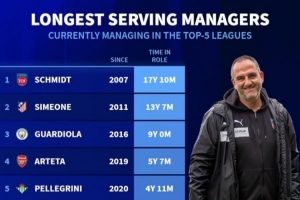 德轉(zhuǎn)列當(dāng)前執(zhí)教同一球隊(duì)時(shí)長(zhǎng)榜: