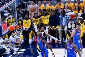 步行者的防守質(zhì)量其實相對穩(wěn)定,總決賽每場都防得不錯,G6談不上防守超水平發(fā)揮,但雷霆進(jìn)攻拉了坨大的。