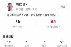 體育資訊6月25日訊 世俱杯小組賽D組第3輪,目前切爾西2比0領先突尼斯希望。其中德拉普為球隊打進1球。比賽第59分鐘德拉普替換下場。賽后媒體為德拉普打出評分7.5分。