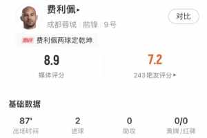 本場(chǎng)比賽,費(fèi)利佩出場(chǎng)87分鐘,他的5次射門里有2次射正,并且全部形成進(jìn)球。更為關(guān)鍵的是,費(fèi)利佩在比賽下半時(shí)制造了對(duì)方門將王大雷的紅牌,這也成為整場(chǎng)比賽的一大轉(zhuǎn)折點(diǎn)。