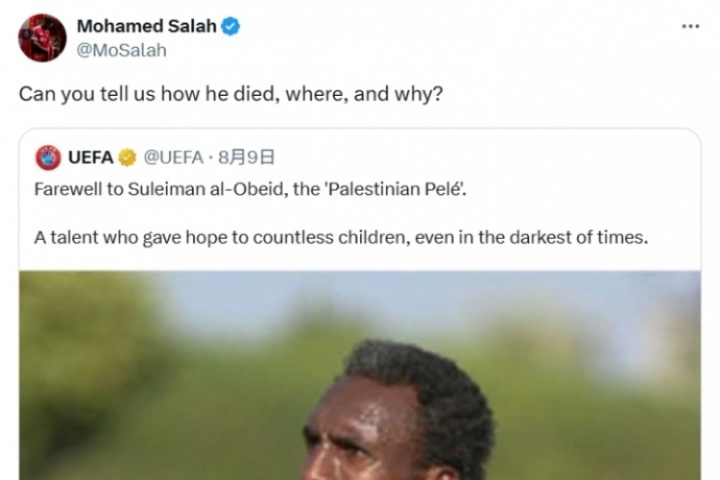 體育資訊08月10日訊 歐足聯(lián)官方此前發(fā)文,向不幸喪生的巴勒斯坦球星奧貝德簡(jiǎn)短致哀。利物浦球星薩拉赫轉(zhuǎn)發(fā)了這則帖文,并發(fā)出了三個(gè)疑問。