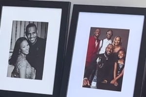 詹姆斯曬出兩張家庭照的相框,分別是他和妻子的合影以及全家福,并配文道:“????”