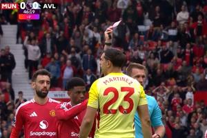 24/25賽季英超最后一輪,曼聯(lián)2-0十人維拉,上半場補時階段,卡什回傳送禮,大馬丁出擊踢翻單刀的霍伊倫,被主裁判直紅罰下。