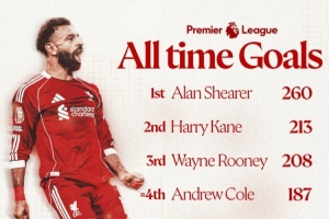 利物浦官方社媒曬出英超歷史射手榜,此役過后薩拉赫的英超進球數(shù)達到187個,追平安迪-科爾并列第四。