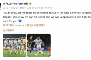 客場(chǎng)戰(zhàn)平,結(jié)果艱難。衷心感謝今晚來(lái)到杭州的每一位球迷。我們知道我們可以做得更好,我們將繼續(xù)拼搏,為你們戰(zhàn)斗到最后一刻。
