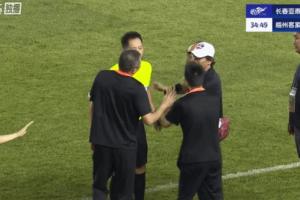 之后長春亞泰斷球發(fā)起進(jìn)攻,卡米洛完成破門。VAR審核后,主裁判王迪維持進(jìn)球有效。梅州教練組工作人員激動向主裁下跪,隨后被人拉起來。
