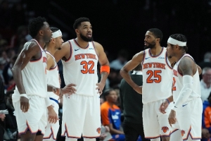 那套由布倫森、布里奇斯、阿努諾比、唐斯和羅賓遜組成的陣容表現(xiàn)倒也沒有異常強大,但比之前的首發(fā)組合還是要好一些的(盡管樣本量較?。?。這套新的首發(fā)陣容在總共65分鐘的季后賽出場時間里,凈效率值為-3.7。