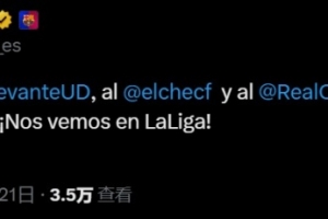 巴薩官方寫道:“恭喜萊萬特、埃爾切和皇家奧維耶多升入甲級(jí)聯(lián)賽,我們在西甲見!”