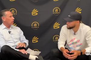 主持人打趣不知道他們能防守誰,庫里表示:“我們不需要真的去防守任何人,5V5的話我們肯定需要有人幫我們防守哈哈哈。”
