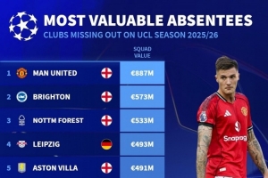 體育資訊8月29日訊 德國轉(zhuǎn)會市場統(tǒng)計了本賽季缺席歐冠球隊身價,并列出榜單,曼聯(lián)8.87億歐居首,布萊頓、諾丁漢森林二三位。