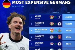 德轉(zhuǎn)列德國籍球員歷史轉(zhuǎn)會費榜:歐元