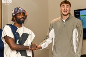 體育資訊6月28日訊 今天,獨行俠的雙狀元歐文和弗拉格在飛翼和狂熱的比賽間歇會面。