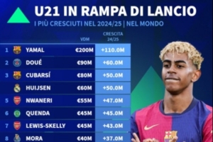 體育資訊6月28日訊 德轉(zhuǎn)列U21球員24-25賽季身價(jià)漲幅排行,亞馬爾+1.1億歐居首,杜埃+6000萬歐第二,庫巴西、懷森并列第三。