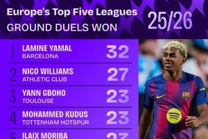 本賽季五大聯(lián)賽地面對抗成功榜:亞馬爾32次居首,尼科27次第二
