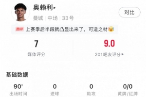 體育資訊9月15日訊 英超第4輪曼市德比,曼城主場3-0擊敗曼聯,奧賴利此役出任曼城左后衛(wèi)打滿全場,球員數據如下:
