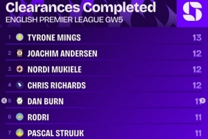 英超第5輪解圍榜: