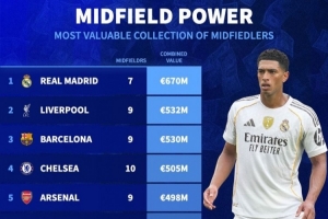 各隊(duì)中場球員總身價(jià)排行:皇馬6.7億歐居首 利物浦第二、巴薩第三