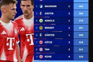 體育資訊9月26日訊 德國轉(zhuǎn)會市場盤點了德甲現(xiàn)役球員聯(lián)賽出場數(shù),諾伊爾以527場居首,基米希、格雷茨卡均299場闖進前10,即將迎來300場里程碑。