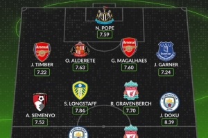 體育資訊10月1日訊 數(shù)據(jù)網(wǎng)站W(wǎng)hoscored盤點了英超9月場均評分最高陣容,具體如下: