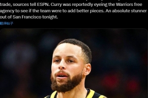 “突發(fā)新聞:據(jù)ESPN消息人士透露,金州勇士隊球星斯蒂芬-庫里已申請交易。據(jù)報道,庫里正在關注勇士隊自由球員市場,看看球隊能否引進更優(yōu)秀的球員。今晚舊金山灣區(qū)發(fā)生了一件絕對令人震驚的事?!盋hef Curry杜撰寫道。