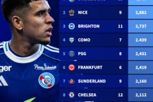 五大聯(lián)賽U21出場時間排行:斯特拉斯堡以5785分鐘高居榜首
