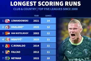 新世紀(jì)五大聯(lián)賽球員最長連續(xù)進(jìn)球榜:萊萬14場 哈蘭德范尼均12場