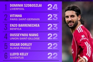 本賽季歐冠贏得控球權(quán)榜:索博斯洛伊24次第一,維蒂尼亞23次第二