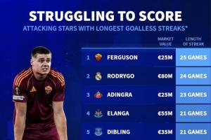 德轉(zhuǎn)盤點(diǎn)進(jìn)攻球員進(jìn)球荒(身價(jià)2500萬歐+):