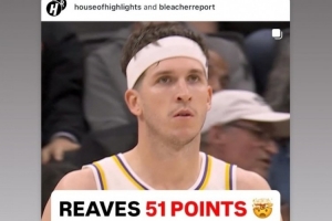 此役,里夫斯出戰(zhàn)39分鐘,22投12中,三分球10中6,22罰21中爆砍生涯新高的51分外加11板9助2斷,正負值高達+22。