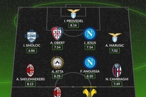 中場(chǎng):薩勒馬科爾斯(AC米蘭,8.15分)、亞瑟-阿塔(烏迪內(nèi)斯,8.29分)、安古伊薩(那不勒斯,8.20分)、尼古拉·坎比亞吉(博洛尼亞,7.49分)